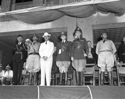 Health Festival, Mineral Wells, Texas; Paul Whiteman, Governor James V. Allred, and others on parade viewing stage, 07/17/1937
