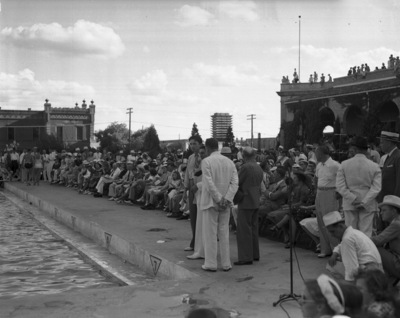 Health Festival, Mineral Wells, Texas; crowd gathered beside swimming pool [Baker Hotel?], 07/17/1937