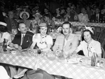 Seated left to right: George P. Marshall, Mrs. James A. Farley, Mr. Farley and Mrs. Marshall pictured at Casa Manana. The men are wearing suits, decorative ties, and collared shirts. The women are wearing dresses with flower corsages. Mrs. Farley has a hat with netting while Mrs. Marshall is wearing a headband with a bow on top. On the table in front of them are several glass cups, bowls, empty soda bottles and napkins. In the background are several people sitting at tables.
