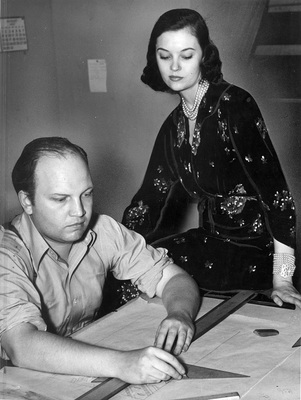 Albert Johnson, Fort Worth Frontier Fiesta set designer, and his new wife, Tilda Goetz, former dancing star in "Jumbo" at the Frontier Centennial in 1936, 07/22/1937. Tidla Goetz is wearing pearl necklace and bracelet.