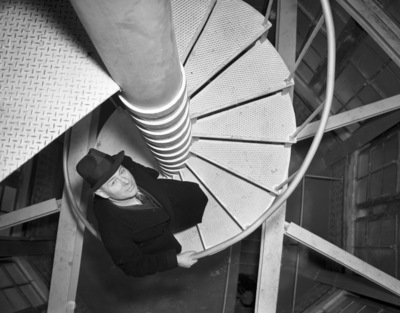 Don L. Johnson, chairman of aviation committee of Chamber of Commerce, climbs stairs to inspect control room at Fort Worth's Municipal Airport, 07/25/1937