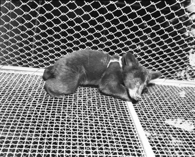 Bear cub in cage after escaping from farm of Dr. Ross Trigg; Dr. W.F. Parsons sent the animal from Mexico as a gift to Forest Park Zoo, 08/02/1937