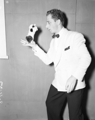 At Fort Worth's Frontier Fiesta, most popular act was Paul Sydell and his trained dogs; Miss Smarty Pants, 4 week old puppy, was trained by Sydell in 10 minutes but gave it to Lauretta Jefferson, ballet mistress at Casa Manana.