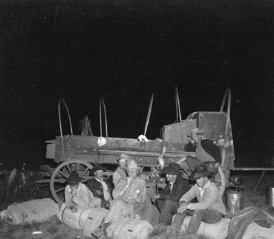 6666 Ranch (Burnett Ranches, LLC) in Texas Panhandle; cowboys sitting on their bedrolls next to wagon around camp fire at night, 09/1937