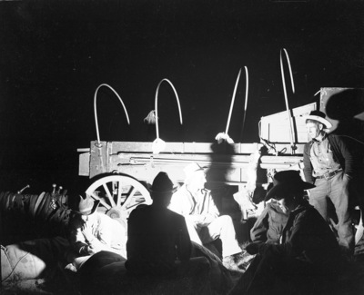 6666 Ranch (Burnett Ranches, LLC) in Texas Panhandle; cowboys sitting on their bedrolls next to wagon around camp fire at night, 09/1937
