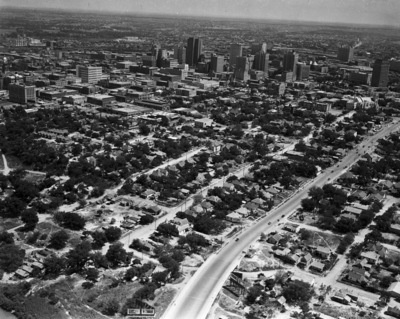 Air view of downtown Fort Worth looking southwest toward town with Henderson St. on right, 09/06/1937