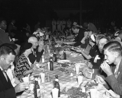Star-Telegram picnic at Frontier Fiesta; group at Amon Carter's table at barbeque, 09/12/1937