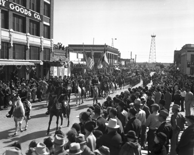 Ranger, Texas, 20th anniversary of oil boom, parade with men on horses and marching band following, 10/21/1937