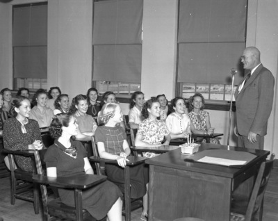 N. E. Buster, principal of Arlington Heights High School, addressing a class of girls, 10/26/1937