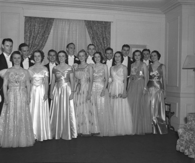 Steeple Chase Ball; left to right, Pauline Hedrick and John Lewis; Sue Harding and Dick Taylor; Elizabeth Ryan and Stanton Karstedt; Sally Trigg and George Beavers; Betty Foster and Marion Hicks; Carol Jane Greene and Bill Voss; Marguerite Tracey and John Steele; Kathryn Hutt and Ed William.