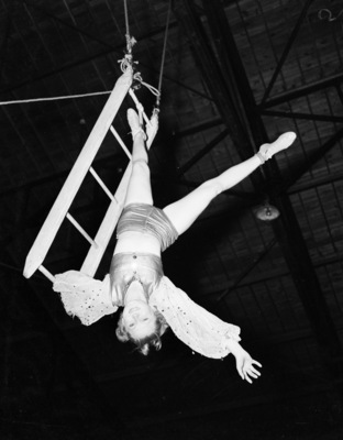 Fort Worth Fall Horse Show and Community Circus; Virginia Montgomery on swinging ladder, 11/1937
