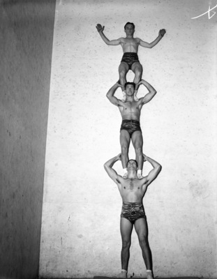 Fort Worth Fall Horse Show and Community Circus; 3-person stack, from top, Pete Colley, N.R. Plunkett, and Perry Luce, 11/1937