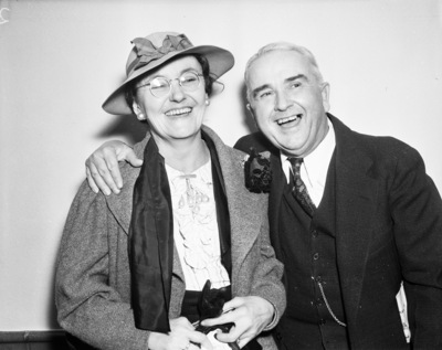 Texas Christian University (T. C. U.) Homecoming; at luncheon, Mrs. S. H. Jenkins of Athens, left, first woman to graduate from AddRan College (predecessor to Texas Christian University (T. C. U.)), and Mrs. J. D. Bass of Mckinney who received AddRan diploma in 1879 as first girl graduate, 11/1937.