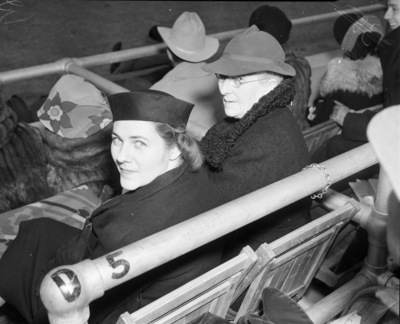 Texas Christian University (T. C. U.) Homecoming; AddRan College ex-student from the 1800s, Mrs. Cora M. Hartgrove (right), former Miss Cora McKinney with her daughter-in-law Mrs. Wilson Hartgrove, former Texas Christian University (T. C. U.) student, both of Paint Rock, 11/1937.