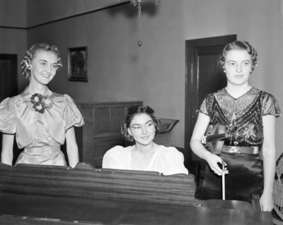 Texas Wesleyan College entrants at Worth Theater for title of Miss Goodfellow; from left, Bobbie Hornburg, Fort Worth; Maxine Melton, Burkburnett; and Helen McClanahan, Blooming Grove, 11/1937