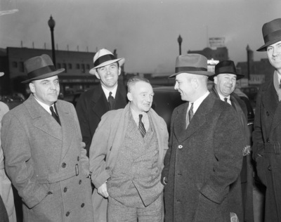 University of Colorado Buffalos arrive for Cotton Bowl football; from left, Colorado Coach Bunny Oaks, J. Curtis Sanford, president of Cotton Bowl Association, Andy Anderson, Houston sports writer, Coach Dutch Meyer of Texas Christian University (T. C. U.), and Pos Parson, sports editor of Denver Post, 12/1937.