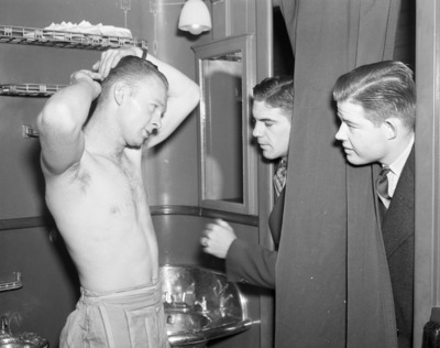 University of Colorado Buffalos football players in town for Cotton Bowl; from right, Bill Jump and Jim Hickey on train, another man is not identified, 12/1937.