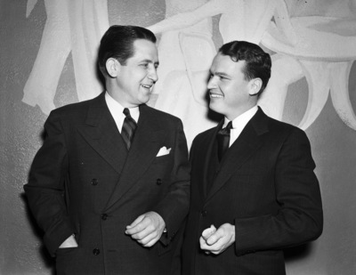 Fort Worth Junior Chamber of Commerce dinner at Blackstone Hotel; from left, Dr. Charles H. McCollum Jr. retiring vice president, and Howard Carrell, new president who succeeds Ray Crowder, 12/02/1937