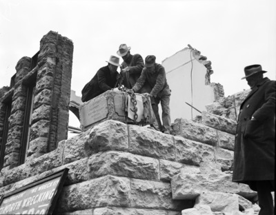 Cornerstone of old Fort Worth City Hall being removed during demolition of building to make way for new City Hall.