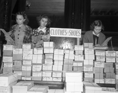 Girl Scouts from McLean Junior High School work on Goodfellows' Christmas bags at the Pioneer Palace; from left, Betty Winton, Nina Elliott, and Betty Sue Wathen, 12/21/1937