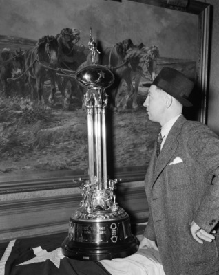 University of Colorado Buffalos football trainer Pos Parsons looks at the Cotton Bowl trophy, 12/22/1937