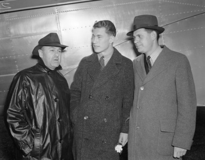 University of Colorado Buffalo's football coach Bunny Oakes; running back Byron "Whizzer" White, and Mark Schreiber, Colorado publicity man, 12/22/1937