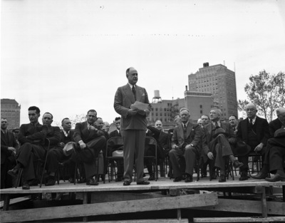 Fort Worth City Hall groundbreaking; Amon Carter on speaker's stand, 12/27/1937