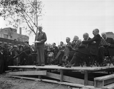 Fort Worth City Hall groundbreaking; Amon Carter Sr. on speaker's stand. A group of men are seated on the speaker's stand behind Carter, and more people are in the audience.
