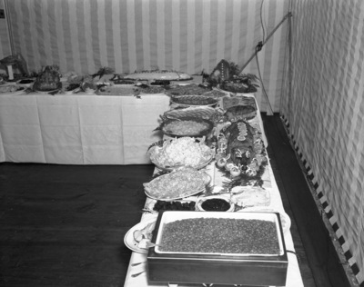 Tables of food at Amon Carter's New Years Party at Shady Oak Farm, 01/01/1938