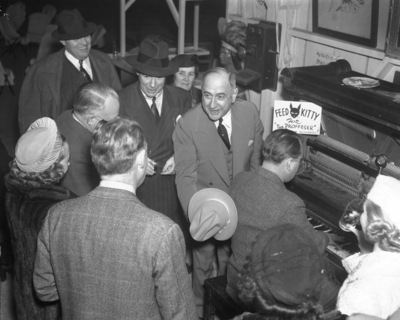 Amon Carter with guests gathered around piano at his New Years Party at Shady Oak Farm, 01/01/1938