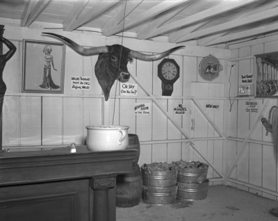 Amon Carter's New Year's Party at Shady Oak Farm; decorated party room with longhorn steer head mounted on wall, 01/01/1938