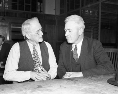Tarrant County Agricultural Association meeting at U. S. Courthouse; W. E. Baker, left, of Crowley, vice president of the Tarrant association, and L. F. Johnston of Arlington, named president of the Tarrant County Conservation Association board, 01/1938.