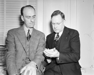 J. H. McAdams (right) head of poultry department of Ralston Purina Mills, with G. M. Philpott, advertising director for the mills, both from St. Louis, for the Texas Purina dealers' convention, Hotel Texas, 01/1938.