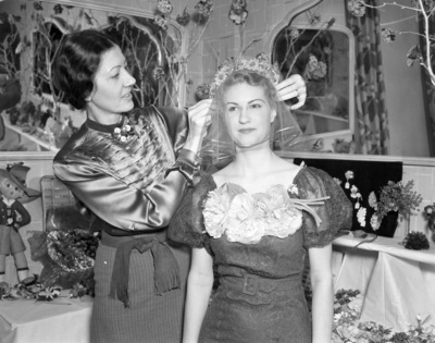 Mrs. A.M. Duke, left, and Jane Plunkett demonstrate evening veil made for formal wear; National Fashion Exhibitors semiannual market, 01/1938