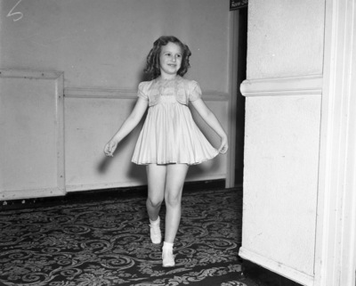 Jo Ann Armstrong, winner in International Shirley Temple contest, wears Spring frock from the National Fashion Exhibitors semiannual show, Hotel Texas, 01/1938