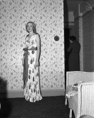 Summer evening gown in graceful print modeled by Mary Kirksey; National Fashion Exhibitors semiannual market, Hotel Texas, 01/1938