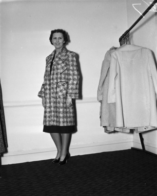 Mrs. L. Britton wears black and white coat of Boule twist tweed; National Fashion Exhibitors semiannual market, Hotel Texas, 01/1938
