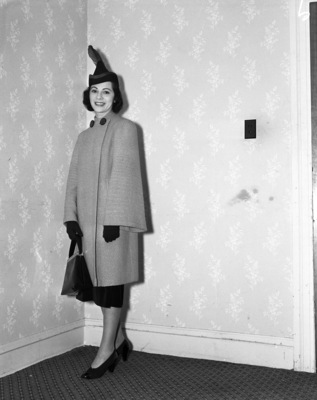 Mrs. Jerry V. Ross models rich gold coat of "krimmer kurl" fabric; National Fashion Exhibitors semiannual market, Hotel Texas, 01/1938