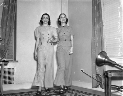 National Fashion Exhibitors, Inc. market at Hotel Texas; Lois Jones, left, and Dolly Farmer model slacks, 01/1938