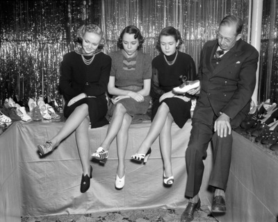 Joint convention of the Texas-Oklahoma Shoe Retailers and Southwestern Shoe Travelers Associations at Hotel Texas; Harry Terhune looks at shoes on the models, from left, Betty Hetherwick, Pat Camp and Frances Williams, 01/08/1938