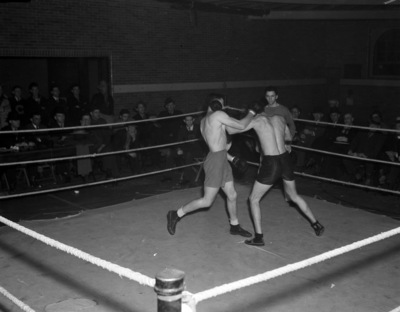Golden Gloves action at Panther City Arena, Y.M.C.A.; Lem Bray (left) of Texas Wesleyan College and Hugh Pitts spar for upset in the 175-pound class, 01/09/1938