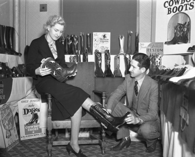 Texas and Oklahoma Shoe Retailers Association convention; Katherine Smith, secretary to Hotel Texas Manager, models boots from Bill Justin, Fort Worth boot and shoe man, 01/10/1938