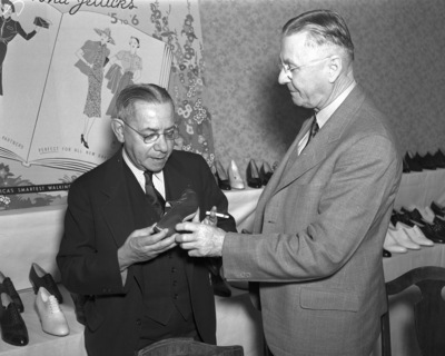 Southwestern Shoe Travelers Association in Fort Worth for Spring style show and convention of Texas & Oklahoma Shoe Retailers Association; J.M. Hartman (left) of Freeport, NY, and W. T. Mitchell (San Antonio), 01/10/1938