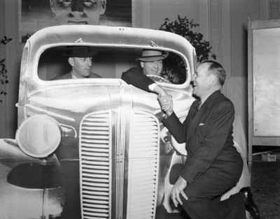 Donald Danborth of Street Louis, president of Purina Mills, in driver's seat of mocked-up "car," shakes hands with R.W. Bridges, sales manager; passenger is G.M. Philpott, Street Louis director of advertising, 01/17/1938