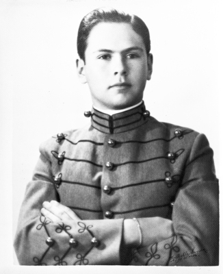 Portrait of Amon Carter Jr. in military uniform. He has his arms folded across his chest and is in front of a plain background.