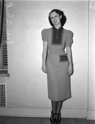National Fashion Exhibitors at Hotel Texas; model shows new fashion to two women, 01/31/1938