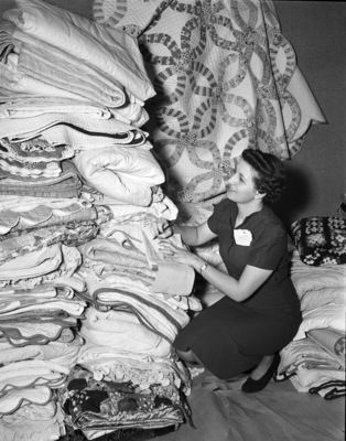 Mrs. E. E. Hedge checks quilts that arrived for the Star-Telegram and Leonard Brothers Quilt Show; more than 750 quilts were exhibited, 02/1938