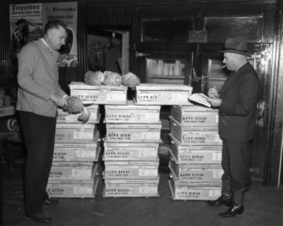 Members of Fort Worth Pointer and Setter Club bought 900 quail from the state to place in 200 locations in the county; From left, John Deem and Warden Roscoe Parks, game warden, count the birds, 02/1938