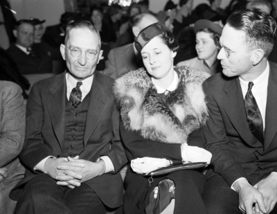 Shackelford County Hereford Breeders' Association banquet, from left, L. J. Ackers (Abilene) and Mr. and Mrs. Guy Caldwell (Albany), 02/1938.