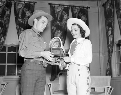 Ranch party River Crest Country Club for debutantes given by Mrs. W.D. Reynolds and Mr. and Mrs. R.E. Harding; cowboy Frank Sheddan and cowgirl Maidee Williams examine replica of chuck wagon, 02/05/1938